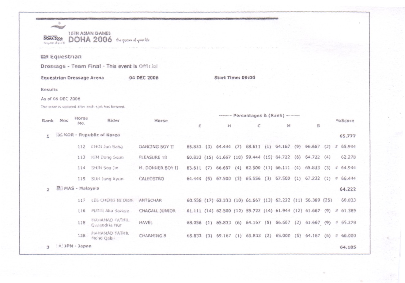 2006年12月1日からカタール国ドーハで開催されたアジア競技大会の馬術競技は、死者1名(韓国)を出したものの