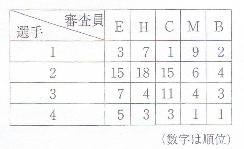 にも拘らず、今回ある国の審査員(B)は自国の4名の選手に1位〜4位の高得点をつけた。