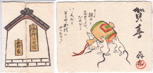 蔵の観音開きの戸を開くと三匹のネズミが打出の小槌をかついで「オーイ親分!忘れちゃだめだよ」と叫んでいる。