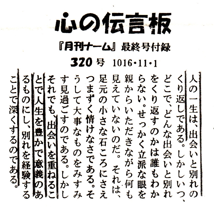 更に、縁は異なもの味なものでN住職が平成2年5月号から連載を始めた「ナーム」の付録「心の伝言板」と私の「馬耳東風」が、