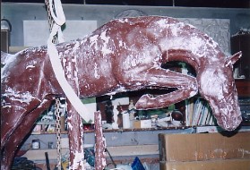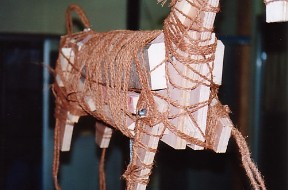 1.デッサンに従って骨組みづくり。肢は動くようにビスで止め。シュロ縄は粘土の滑り止め。![]() | ![]() |