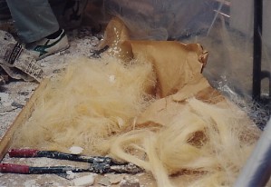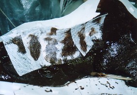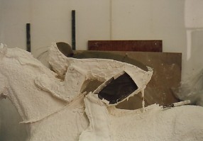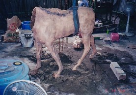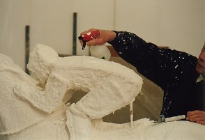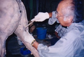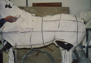 4.粘土の上に水で溶いた石膏をふりかけ、針金で補強した上、更に石膏で塗り固める。![]() | ![]() |