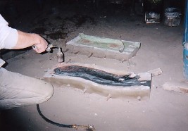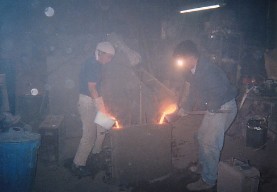 15.一気に銅を隅々まで廻るように砂型に銅を流し込む。銅が隅々まで廻らなければやり直し。![]() |