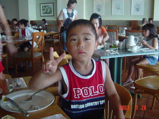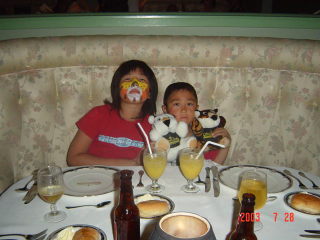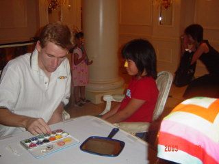 夜は「サンド・キャッスル」というディナーショーを見ました。入り口で子供には顔にペインティングをしてくれました。ショーは踊りあり、歌あり、マジックありで子供も楽しんでいました。 |