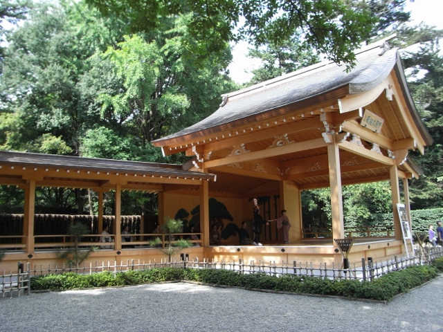 武田の杜の木々を背景にした、大変美しい能舞台です。武田神社教室では、その舞台や楽屋を贅沢に使用してお稽古をいたします。武田神社は観光名所でもありますので、舞台で舞っていると自然とギャラリーができていることも!?