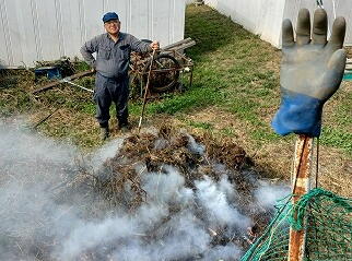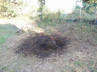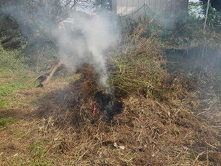 『附属農園』の除草作業は11時45分くらいに終了、そこから法面下の雑草の山の焼却に取り掛かりました。かなり長い間干してありますし、このところ4日間は晴れていましたから直ぐに焼却できるだろうと考えて居ましたがそれは甘かったです・・・。今年の10月は雨の日が多かったから乾ききっていませんでした。3時間くらい掛かって焼却作業しましたが、完全には燃やしきれませんでした。