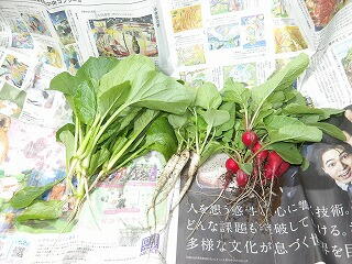 黒染め終了後、記録を付ける前に『小松菜・ラディッシュ・・・?二十日大根』を収獲しました。『二十日大根』はまだ小さかったので3本だけにしました。『小松菜』もまだ少し小さいです。