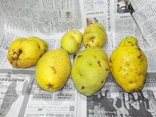 また、『カリン』が2つ落ちていたので収獲し時と考え手の届くところの物を収獲しました。今年も実が付いた時期に忌避剤を撒いてやったためでしょうか綺麗な『カリン』が収穫出来ました。ただ、高い位置の忌避剤が届かなかったところはちょっと汚い感じです。