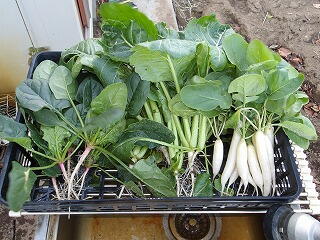 作業を終えてから野菜を収穫しました。明日、長男夫婦が遊びに来るという事なので、『小松菜』・『二十日大根』・『ホウレン草』を収穫しました。また、『柚子』と『カリン』も持たせるつもりで居ます。