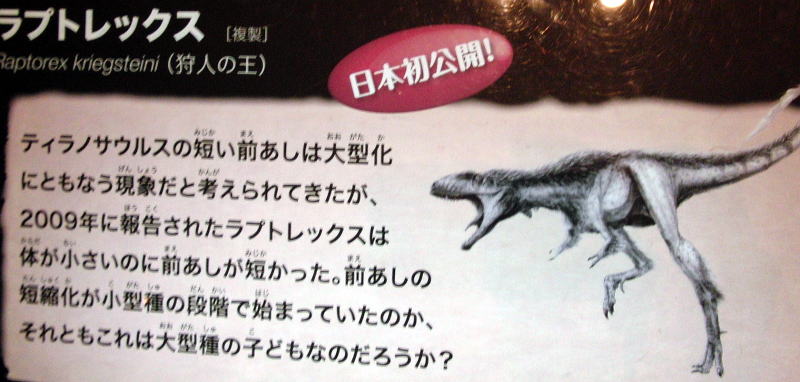 最近のCTによる解析でT REXの嗅脳が大きく嗅覚が発達していたのではとのことで、ハンターではなく死肉をあさっていたのではということも言われてきた。恐竜博2011ではこれらの肉食恐竜達の短い前脚がどのように使われていたかにつき面白い見解をだしている。