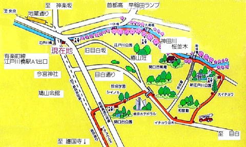 地下鉄有楽町線江戸川橋駅から椿山荘の庭園入り口冠木門を過ぎ、神田川沿いの江戸川公園を800mほど歩くと胸突坂が右側に見えます。