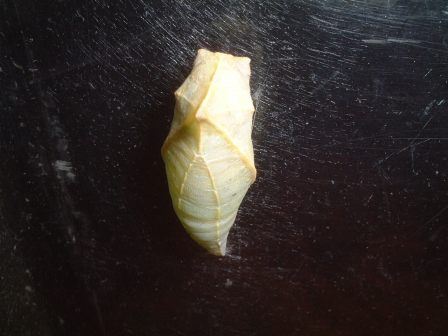 ↑さなぎ 淡い黄緑色をしている。 直線的で、鉱物を思わせる形である。 |