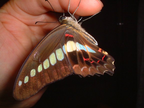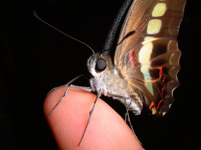 ↑羽化したてのアオスジアゲハ こうして近くで見てみると、案外、 赤い模様がワンポイントとなって決まってる! |