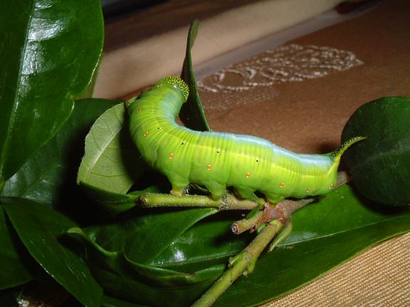 ↑オオスカシバの幼虫 昨年のオオスカシバ成長期で紹介したものと少し色彩が異なっている。 さえた黄緑色と、背中の水色の線が美しい。 8月12日、羽化して飛び立った。