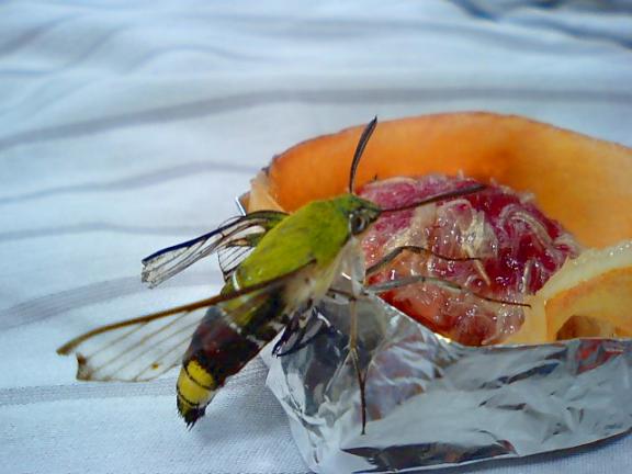 ↑モモから吸蜜するオオスカシバ 羽化に失敗し羽が伸びていないものだが、果実からの吸蜜の瞬間。 |