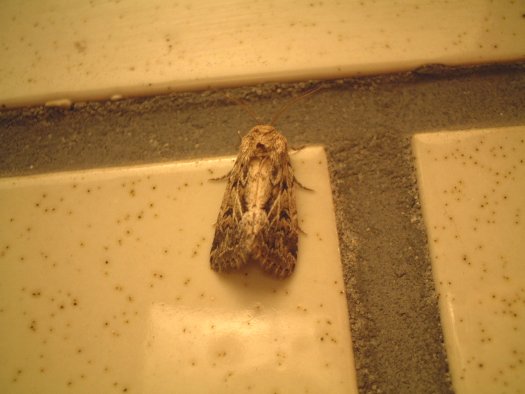 ↑フクラスズメ?? 街灯に飛んできた。近づくと、 少しパタパタやって、後ろ羽も見せてくれた。 にもかかわらず、本当にフクラスズメか自信がないm(__)m →2005.07:カビさんより、スジキリヨトウではないかとご意見いただきました。 |