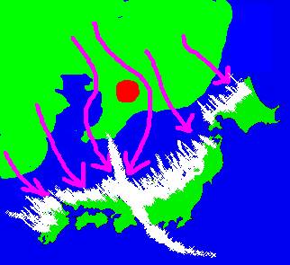 寒気がさらに強いと、太平洋側まで突きぬけることがあります(上の絵)