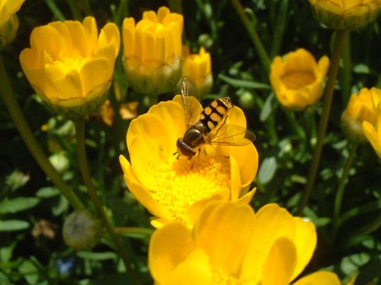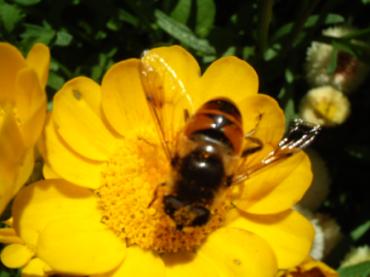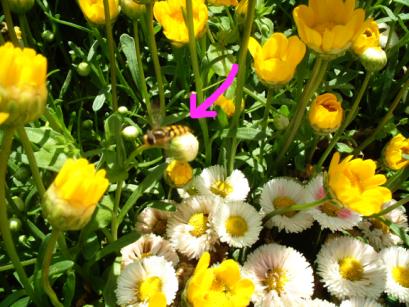 ↑空中停止(ボバリング)するナミホシヒラタアブ