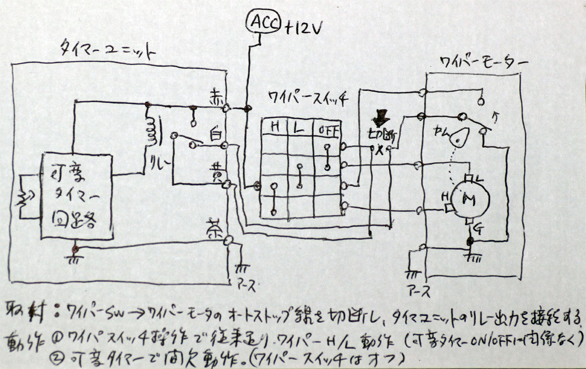 木村さんに古い間欠ワイパーコントロールユニットを貰ったのは良いが取説はおろか結線図もない。そこでバラシて回路を調べ、試行錯誤しながらなんとかワイパーモータに接続。