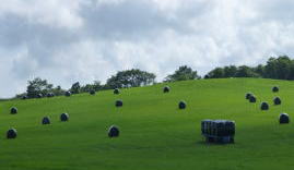 両側に牧場が広がるミルクロード 牧草を集めたロールベールが あちこちに積み上げられています 白や黒のロールベールが点在する 光景は一見の価値あり!