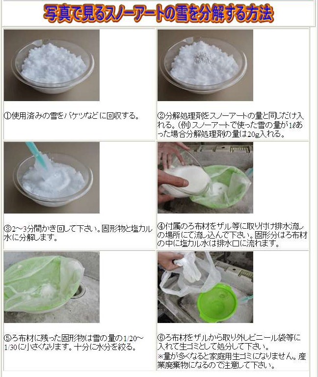 ■用 途 スノーアート業務用をご使用の際ゴミの量が多くなるので分解処 理剤をご利用下さい。 ■特 徴 ●作業が簡易。スノーアートと水にすばやく分解し、ゴミの量が 1/20〜1/30に小さくなります。 ■使用方法 (例)スノーアート1gに対して水50ccの割合で雪を作った場合の 処理方法。 @ まずはじめに雪をバケツなどに回収する。 A スノーアートの量と分解処理剤の量は同じ量を使います。これを目安 にしてバケツの中に分解処理を入れて下さい。 B 分解処理剤をバケツの中に入れたら2〜3分間かき回して下さい。 固形分と塩カル水に分離します。 C これを流し台等に持って行き、ザルとろ布材を用意してバケツの 中のものを流し込むと塩カル水は排水口へ流れ、固形分がろ布材に 残ります。 Dろ布材の中の固形分はよくしぼり、小さくした上で生ゴミとして処分して 下さい。 ※量が多くなると家庭用生ゴミになりません。産業廃棄物になるので注意 してください。 <品質表示> 成 分 塩化カルシウム 内容量 800g 2,420円/袋(税込) |