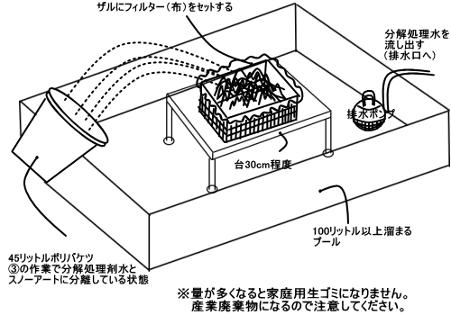 現地にてスノーアートの雪を分解する方法 ① 雪原の一角に雪をかき分けて、処理作業スペースを確保する。(2m×2mのスペース) ② 45ℓ用ポリバケツにスコップ、ホウキ、チリ取り等の道具を使って雪を入れる。 ③ 次にそのポリバケツに分解処理剤を800g入れて2~3分間掻き回し作業を行う 分解処理剤液とスノーアートに分離します。 ④ 隣接する場所に100ℓ以上溜めることができる出来るプールを用意しその中に30cm程度の 台と水が抜けるザルにフィルター(布)をセットする。 ⑤ ③の作業で出来たポリバケツをザルに流し込むと、分解処理剤液はプールに入り スノーアートは フィルター内に溜まることになる。 ⑥ プールに入った分解処理剤液は、排水ポンプ又はバケツ等で、排水口へ流し出す。 フィルターに残ったスノーアートはよく絞り、フィルター(布)に包みゴミとして処分する。 ![]() |