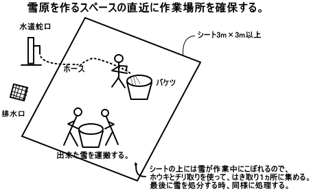 白いガムテープ等で、つなぎ止める。このシートの上に雪を敷き込む。