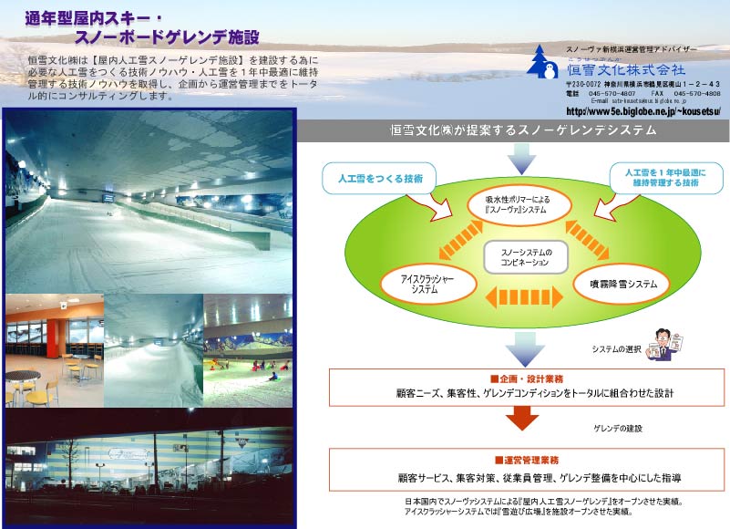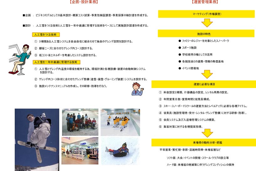 | ・みて!ふれて!すべって!・・ファミリーゲレンデ ・スキー・スノーボードスクールの運営 ・一年中クリスマスをテーマのレストラン・物販 ・雪国の文化展示館 |