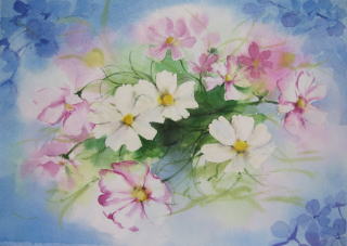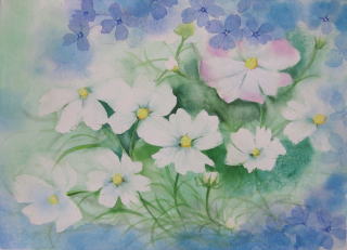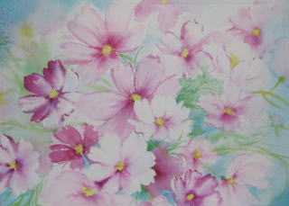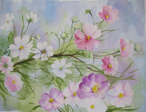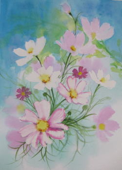 短命だったコスモスを一杯描きました。コスモスの多い今回のアトリエです。