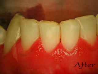 画像: 茶色く着色しています。歯と歯茎の境目に歯石が沈着しています。歯茎が炎症して赤く腫れています。