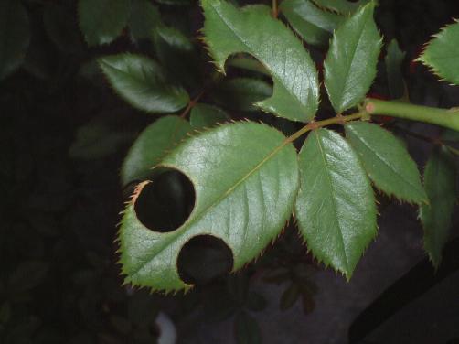 丸く切られたバラの葉 バラハキリバチの犯行である。 バラの葉を切り取り、巣の材料に持ち帰ってしまう。