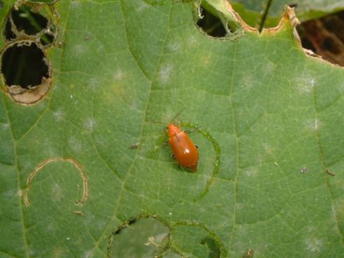 ウリハムシ 葉っぱに大量にいたが、シャッターを切った時には 1頭しか映らず…マックロクロスケが連想される(笑)