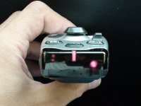 っで、困ったときのインターネット。調べてみると、ちゃ〜んとリモコンネタが載ってました。それによると、リモコンが発光しているかどうかは目視では全く分かりませんが、デジカメとかビデオの電子ファインダーを通して見ると赤または白に発光して見えるとのこと。電子カメラのCCDは可視光よりも若干広い帯域を受光しているため、このようなことになります。以前某社のビデオの暗写機能で薄着の女性が透けてしまう問題がありましたが、まあ、それも赤外光を受像したためのものです(話の本筋とは関係ないですね、すいません)。で、普通のリモコンで試してみたのが上の写真。中央の四角い光が人間に動作を確認させるための赤色LEDで、右側の丸い光が赤外光です。もちろん、直接目で見た場合は、右の丸い光は全く見えません。リモコンがらみのトラブルで、発光側の問題か受光側の問題かが特定できずに困ることが時々ありますが、デジカメを持ってくれば一発で確認できるわけです。これは便利!