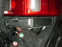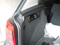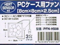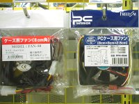 っで、いろいろ検討した結果、リアサス上部の空間から吸気することにしました。ファンは、パソコンショップで普通に売ってる、PC用の12Vのファンです。ここのスペースに合うサイズで、80角25mm厚の、ごく一般的なものにしました。冬場はファン不要なので、スイッチをつけて季節に応じてON/OFFしようかとも思いましたが、きっと面倒くさくて2年目くらいからはON/OFFし忘れるのが目に見えているので、温度センサー付きのものを選びました。センサ付きファンはべつに特殊なものではなくて、PCショップとかで普通に売ってます。上の写真は、近所のヤマダ電気で売ってるところをコソッと撮ってきたものです。左写真の左側のはセンサなしで右側のがセンサ付き、センサ付きの方で1500円くらいでした。24℃だと1800回転、85℃で3100回転と書いてあります。で、このファンを下写真の位置に取り付けました。