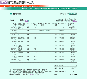 あと、ETCの前払い割引サービスは、上表のような利用明細がインターネットで簡単に見られるので、便利です。ただ、奥様に内緒の用事で有料道路をご使用になったりすると簡単に足が着きますから、ナビの走行履歴ともども注意が必要かもしれません(私の場合、とりあえずその心配はありませんけど!?)。まあ、全体としては、「ETCはとても便利だ」という感想に変わりはありません。