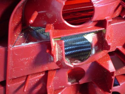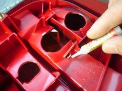 ウィンカーをオレンジに光らせている着色レンズは、電球を囲むような円筒形をしています。この着色レンズは、リフレクタ(銀色の反射板)と一体成形になっていて、着色レンズ部分を単純に切って取ってしまうと、リフレクタがバラバラになって外れてしまう可能性があります。なので、加工に先立って、リフレクタを瞬間接着剤とエポキシ接着剤を併用して固定しておきます。