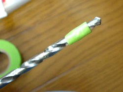 次に、レンズ部分を切り落としても、切り落とした部分が取り出せないとどうしようもないので、取り出しが簡単になるように先にレンズ部分を中央から2つに切断できる状態にしておきます。ドリルは、すっぽ抜けてスモークレンズに内側からキズをつけてしまうと厄介なので、先端にテープを巻いて、一定以上に突き出さないようにしておきます。っで、オレンジの着色レンズに連続して穴を開けて、左右に割れやすいようにします。