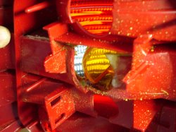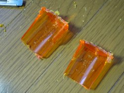 切り取った着色レンズは、当初予定では半分くらい引き出してから2つに割ろうと思っていましたが、元々の組立方向が向こう側からのため、こっちに抜けないようなひっ掛かりがあって、少しも出てきません。仕方がないので、中でまず2つに割って、それから取り出すことにしました。割れ目をけっこうギリギリまで入れておいたのが奏功して、ペンチを内部に突っ込んでレンズを強引に開いたら、なんとか割ることができました。取り出したレンズが右写真です。