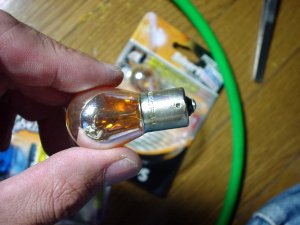 電球は、お約束のシルバービジョンです。シルバービジョンは150゜ピンタイプで、車のソケット側は平行ピン(180゜タイプ)なので、これまたお約束の加工で、ピンを片方削り落としました。最近は平行ピンタイプのこの手の電球も出ているようなのですが、入手経路などがチト分かりませんでした。まあ、ピンを片方削った状態で、実質は何ら問題ありません。