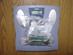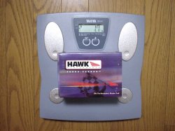 あっ、忘れそうになりました(笑)。ブレーキネタの続きです。ホースは返品して代品要求中で、来週の前半には着くようです。送料往復で1,700円くらい掛かっちゃいましたが、まあ致し方ないでしょう。取りつける前に、重さを量ってみました。キャリパー単体が2.4kgですね。結構軽いです。ノーマルのキャリパーが何キロか、外したら測ってみようと思います。パッドは、ミンテックスとかいうメーカーのだってHPに書いてあったのですが、箱をよく見たらホークのでした(写真撮って掲載しておいて、自分でよく見てませんでした爆)。こっちの方が多少とも聞き覚えがありますね、HPSというグレードです。パッドは左右分で1.7kgです。