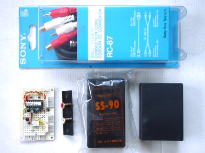 写真の上に写ってるのがSONYバス延長セット。左下がたぁぼぉさんから頂戴したドングルの評価品です。その右はAUX入力用のピンジャックとプラスちゅっくケースです。基板のサイズをちゃんと測っていなかったので、ケースは一応2種類買ってきました。