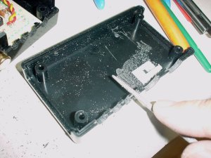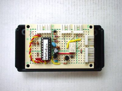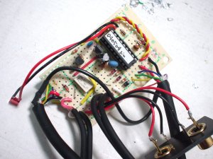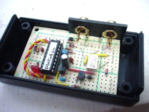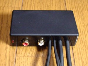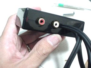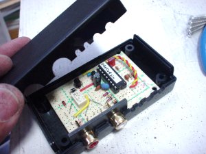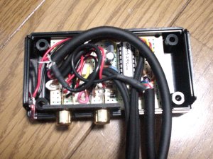 っで、一応ケースには納まるようになりました。ケースに合わせて基板やコネクタを加工したので、はハメるだけで位置が決まるようにできて、かえって良かったかもしれません。ピンジャックが引っ込まないためのストッパ(さっき外したコネクタのハウジングの再利用です、笑)を貼っただけで、あとは、その蓋を閉めれば全部の部品の位置が決まってしまいます。基板は多少ガタガタしますが、ケーブルを直結すればガタガタは自然と治まるはずです。