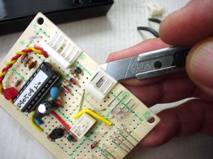 たぁぼぉさんが基板の周囲にIO用のPINコネクタをつけてくださったのですが、これはケースからはみ出すので使えない状態。せっかくつけて下さったのを申し訳ないのですが、外して直結にします。っで、基板の幅自体もはみ出しているので、カットすることにしました。