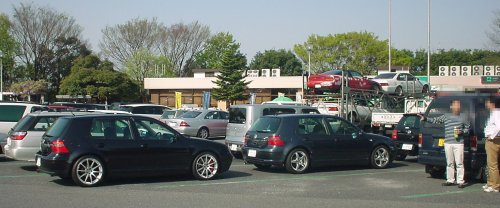写真右側のお二人が、yamjunさんとREDHEADさんです。ほら、人の車を指さしてますね(冗談爆)。インター毎に車をローテーションするのは良いのですが、私はREDHEADさんの次の順番だったので、いつもシート座ると足がペダルに届かず、スライドを4〜5コマくらいまえにズラスのがとても悲しかったです。くやしいので、降りるときはスライドを4コマくらい後ろにずらして、ちょっと見栄を張ってみました。きっと、REDHEADさんも同じことをしていたに違いありません。
