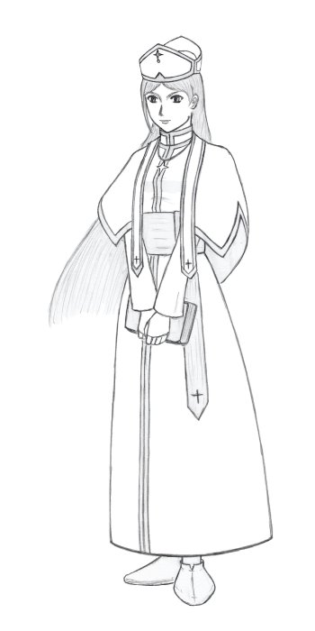 〔神官衣アレシア〕 ファリス神官の式服(?)姿……のつもりです。……ちょっと偉そうな感じになっちゃったかな? ローマ教皇の代替わりの時期に放送されていたテレビ番組で見た僧服が元ねたです。 長衣の色は、濃い紫色か濃紺で、帯(?)は赤かったかな…?ちょっと記憶があやふや。 赤色だと、カトリックの枢機卿の衣装だった可能性も…(爆) まぁ、全身赤というわけではなかったから、違うかな…… 帽子は元ねたでは違う形のものでした。これはカトリックの司教冠(?)ぽくして見ました。 この服は、濃い紫や濃紺の色のが映えそうですね…後、男性のが似合いそうです(笑) 聖印の意匠は縦軸と横軸が同じ長さの十字にして、公式設定に近くしてみました。 でも、帽子の聖印の意匠だけは、下にオーブを付けて、遊んでみたり(笑) 実は、作業を4ヶ月以上放置されていた割りと不遇な絵だったり。 ちょっと軸がぶれてそう、というのと、原画の顔の輪郭が気に入らなかったのが原因かな? |