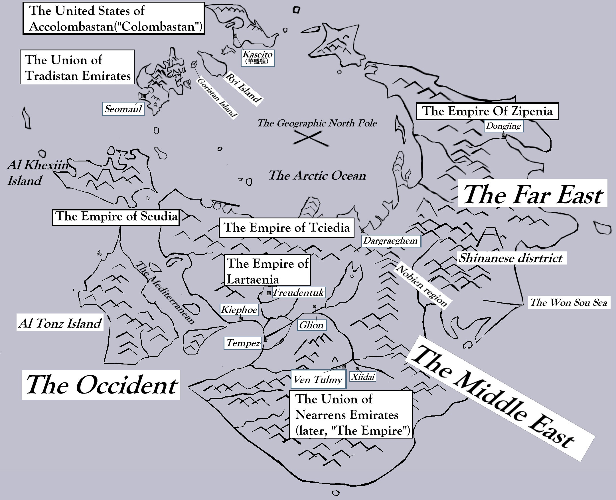 上図は、オデュプサイ・セボンの北極を中心にした略図である。見てのとおり、「とある列島を大陸サイズ」に拡大し