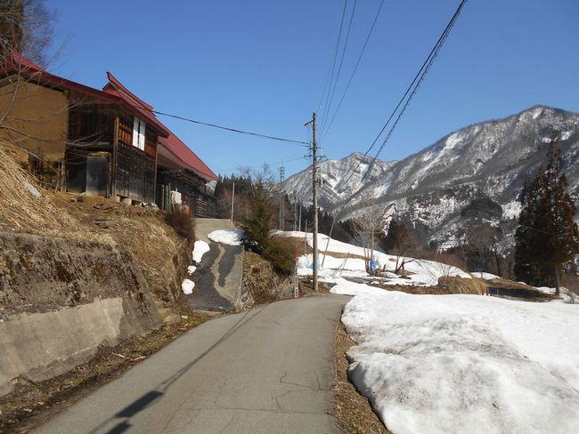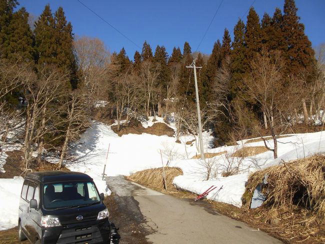 山小谷温泉に向かう県道から大草連に向かう里道に入る。 狭く急な道だが、居住者がいるので除雪が入るようだ。 しかしここのところの暖かさで、土手は露出し、フキノトウでも出そう。 春の光景である。除雪終了点に車を停める。 |