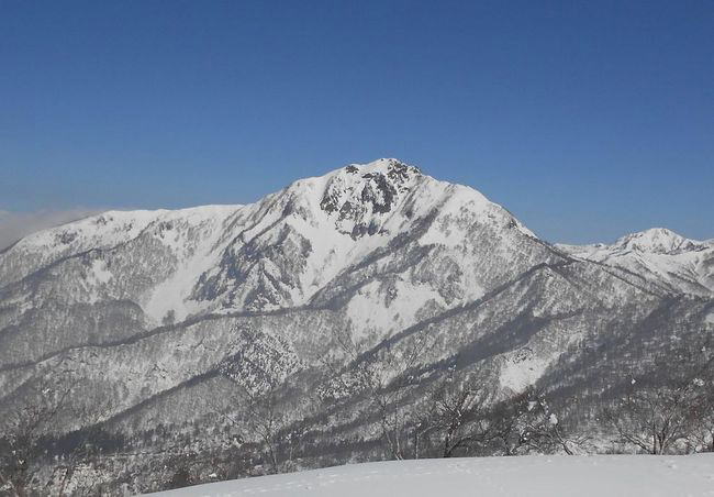 大渚山山頂からの雨飾山 前沢奥壁がそびえ立つ 前沢もいつか滑ってやろうと思っていたが、たぶんもう機会はないだろう。 |