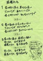 <<ツアーパスの表記>> 柴田「一緒に楽しんで、忘れられないツアーにしようね」 大谷「来て正解!!」 斉藤「心に残る三日間を・・・楽しもうね!!」 村田「FCツアー待ってましたー!!メロンと皆、気持ちは1っょ。精神統一」 相変わらず、斉藤さんは達筆で、マサオはアレだ。 |