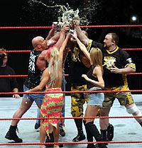 | ROAD TO WRESTLEMANIA TOUR 見てきましたWWE。 ![]() WOOO!ステイシー!! 約半年に1度お目にかかれるWWE日本公演。 今回の目玉はSCSA、”ストーンコールド”スティーブ・オースチン。 あのガラスの割れる音が聞きたくて、SS席2万円(定価)払いましたよ。 結果は上リンクのスポナビかその辺を見てください。 公演前にFC会員の限定イベント(握手・サイン会)に参加。 1000円ですよ。1000円。 やっぱりどこぞのアレとはレヴェルが違うんですよ。 イベントに来られたスーパースター(レスラー)は、RVDとベノワ。 ベノワの顔の小ささがとても印象的でした。首太ッ!! ちょうど公演も半ばに差し掛かったところ、 悪のGM(ゼネラル・マネージャー)エリック・ビショフが登場するのですが、 リングアナのコールになぜか因縁を吹っかけてきました。 リングアナを罵るビショフ。危うしフィンケル(リングアナ)! ガシャーン!!(ガラスの割れる音) ジャジャッジャジャージャジャン! ![]() ストンコキタ━━━━━━凸(゚∀゚)凸━━━━━━ !!!!!! ![]() 観客の沸き加減を見るオースチン オースチンがビショフをおちょくりだします。観客は語学力が乏しいので適当に”WHAT!”の連呼。 言葉の意味はよく分からんが、とにかく凄いことを言ってます。(たぶん) まあなんとなく和解しようと試みるビショフ。 オースチンの和解の証はビールで乾杯なんですが、匂うぞ!スタナーの匂い。 と思った瞬間、やっぱりキタ━━━━━━(゚∀゚)━━━━━━ !!!!!! スタナー!!(大合唱) 哀れビショフは景気良く吹っ飛び皆満足。 オースチンは機嫌が良いのか、美女2人を招きます。 さあハッピーエンドとなる瞬間、 今回のツアーで最も人気の無い事が証明されたIC(インターコンチネンタル王者)ランディ・オートンが襲撃! ビッシビシにやられるオースチン。 調子に乗るオートンは四方でオースチンのビール飲みを真似るのですが、 そんなのが許される訳も無く、すぐに復活したオースチンのスタナーの餌食に。 これで終わりかと思ったら、今度はマット・ハーディが。 オートンと同じようにオースチンを襲撃。どうなるオースチン! すると今度はこの前の試合で、惜敗したダッドリー・ボーイズが乱入。3Dの体勢でマットが振り返るのを待っています。 案の定、「志村後ろ〜」状態のマットに観客の声が当然届かない訳で、振り返ったマットは3Dを喰らい昇天。 めでたしめでたし。 ついでにハリケーンもなぜか登場し、みんなでビールかけ。凸(゚∀゚)凸凸(゚∀゚)凸凸(゚∀゚)凸凸(゚∀゚)凸 ![]() キレイどころは集中的にビールをかけられ、水もしたたるイイ女の出来上がり。 観客皆満足。 これを生で間近で見れただけで2万の価値は有ります。ハイ メインイベント ![]() 挑戦者クリス・ベノワ VS 世界ヘビー級王者HHH(トリプルエイチ) ![]() 実にジャパニーズスタイルの試合内容でした。 ちょっと固執しすぎかも知れませんが、それなりに見所のあった試合だったかと思います。 個人的に、 リック・フレアーがイイ! 50過ぎたおっさんがプロレスするのも凄いが、 (タイツをひっぱられ)生尻を数分間露出したまま7000人の前で試合するなんて。 鶴瓶を越えた! もう師匠と呼ばせてください。m(..)m さすがに100万画素のカメラは辛い。 次開催までにちょっとイイカメラを買お。 |